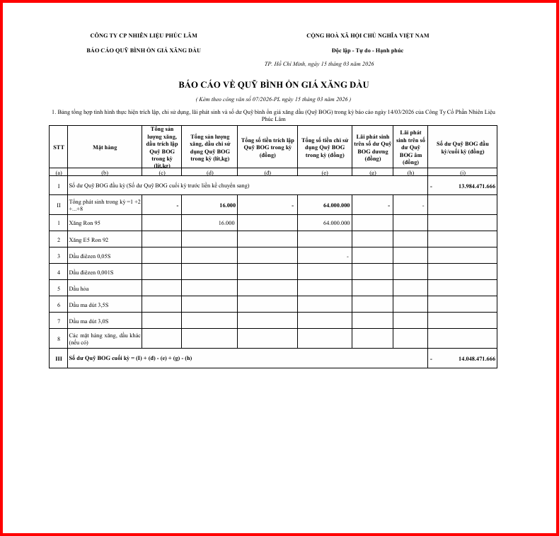 Công ty Cổ Phần Nhiên Liệu Phúc Lâm xin báo cáo Quỹ bình ổn giá xăng dầu Ngày 14.03.2026 là: -14.048.471.666 vnđ