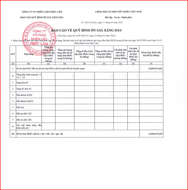 Công ty Cổ Phần Nhiên Liệu Phúc Lâm xin báo cáo Quỹ bình ổn giá xăng dầu Ngày 16.03.2026 là: -14.060.471.666 vnđ