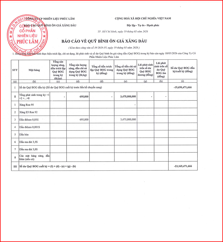 Công ty Cổ Phần Nhiên Liệu Phúc Lâm xin báo cáo Quỹ bình ổn giá xăng dầu Ngày 18.03.2026 là: -23.165.471.666 vnđ