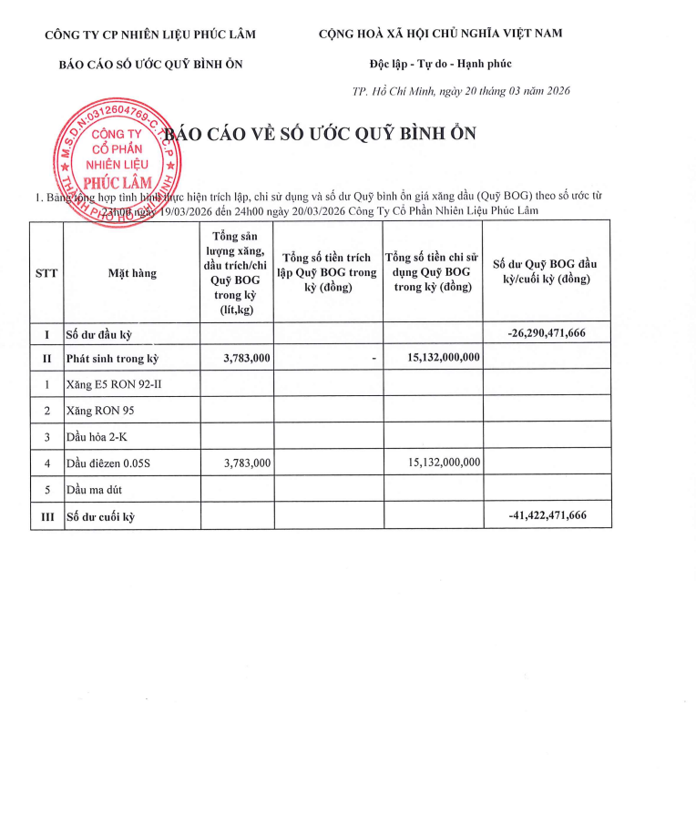 Công ty Cổ Phần Nhiên Liệu Phúc Lâm xin báo cáo Quỹ bình ổn giá xăng dầu Ngày 20.03.2026 là: -41.422.471.666vnđ