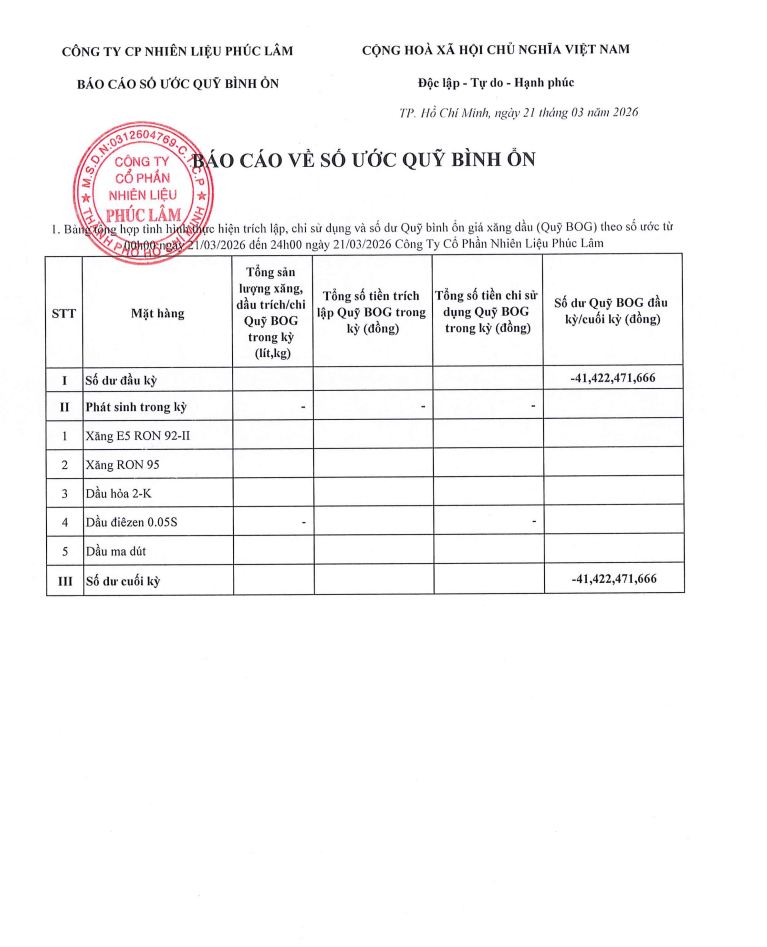 Công ty Cổ Phần Nhiên Liệu Phúc Lâm xin báo cáo Quỹ bình ổn giá xăng dầu Ngày 21.03.2026 là: -41.422.471.666vnđ
