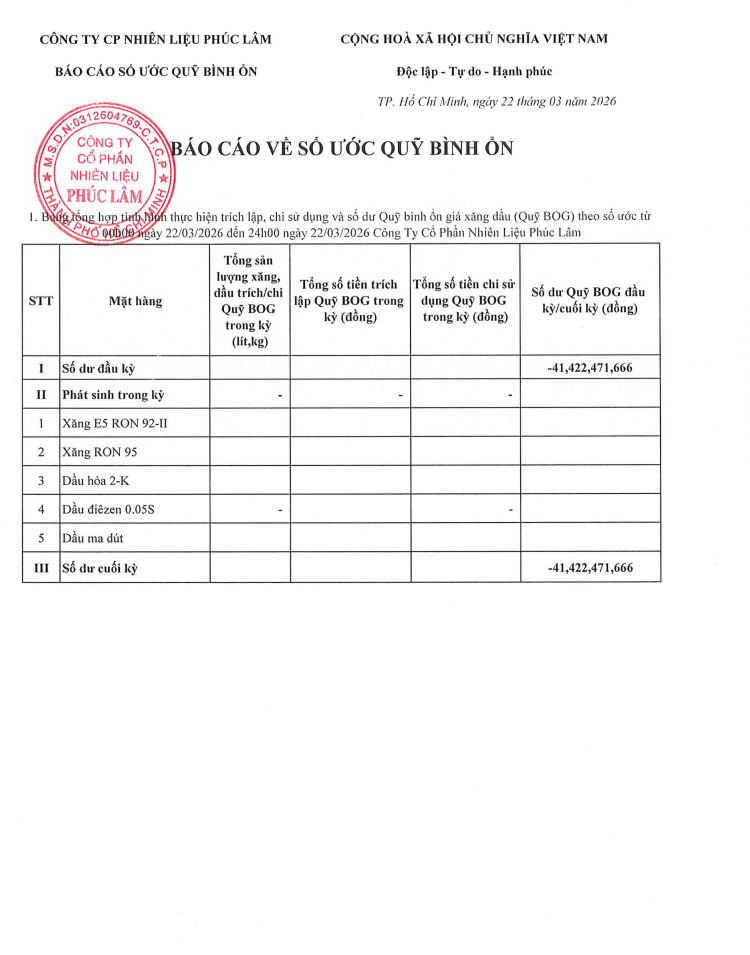 Công ty Cổ Phần Nhiên Liệu Phúc Lâm xin báo cáo Quỹ bình ổn giá xăng dầu Ngày 22.03.2026 là: -41.422.471.666vnđ