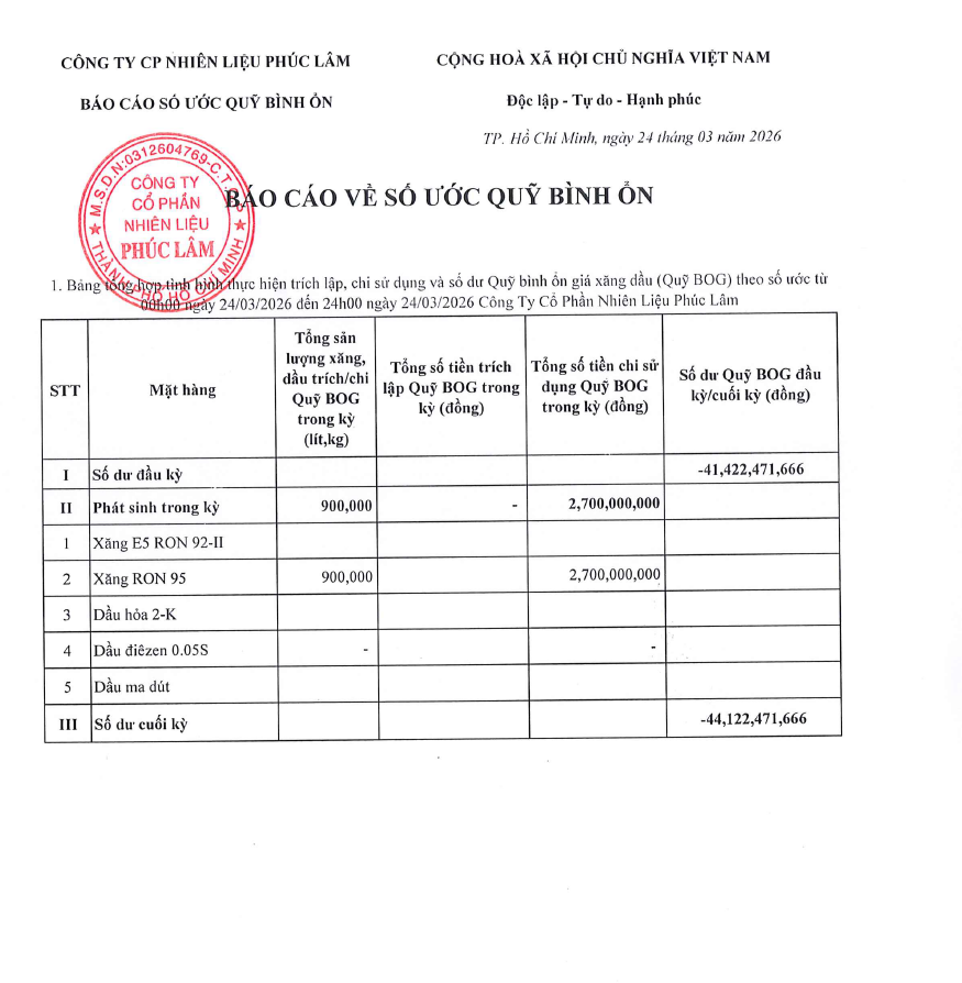 Công ty Cổ Phần Nhiên Liệu Phúc Lâm xin báo cáo Quỹ bình ổn giá xăng dầu Ngày 24.03.2026 là: -44.122.471.666vnđ