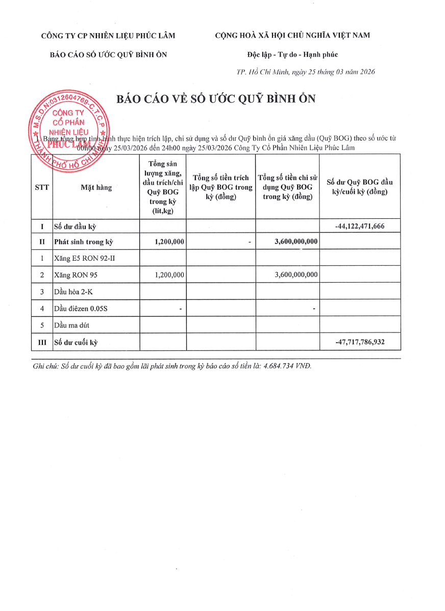 Công ty Cổ Phần Nhiên Liệu Phúc Lâm xin báo cáo Quỹ bình ổn giá xăng dầu Ngày 25.03.2026 là: -47,717,786,932vnđ