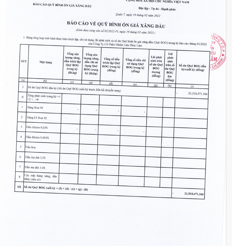 Công ty Cổ Phần Nguyên Liệu Phúc Lâm xin báo cáo Quỹ bình ổn giá xăng dầu Tháng 01.01.2022 - 31.1.2022 là: 21.510.471.166 vnđ