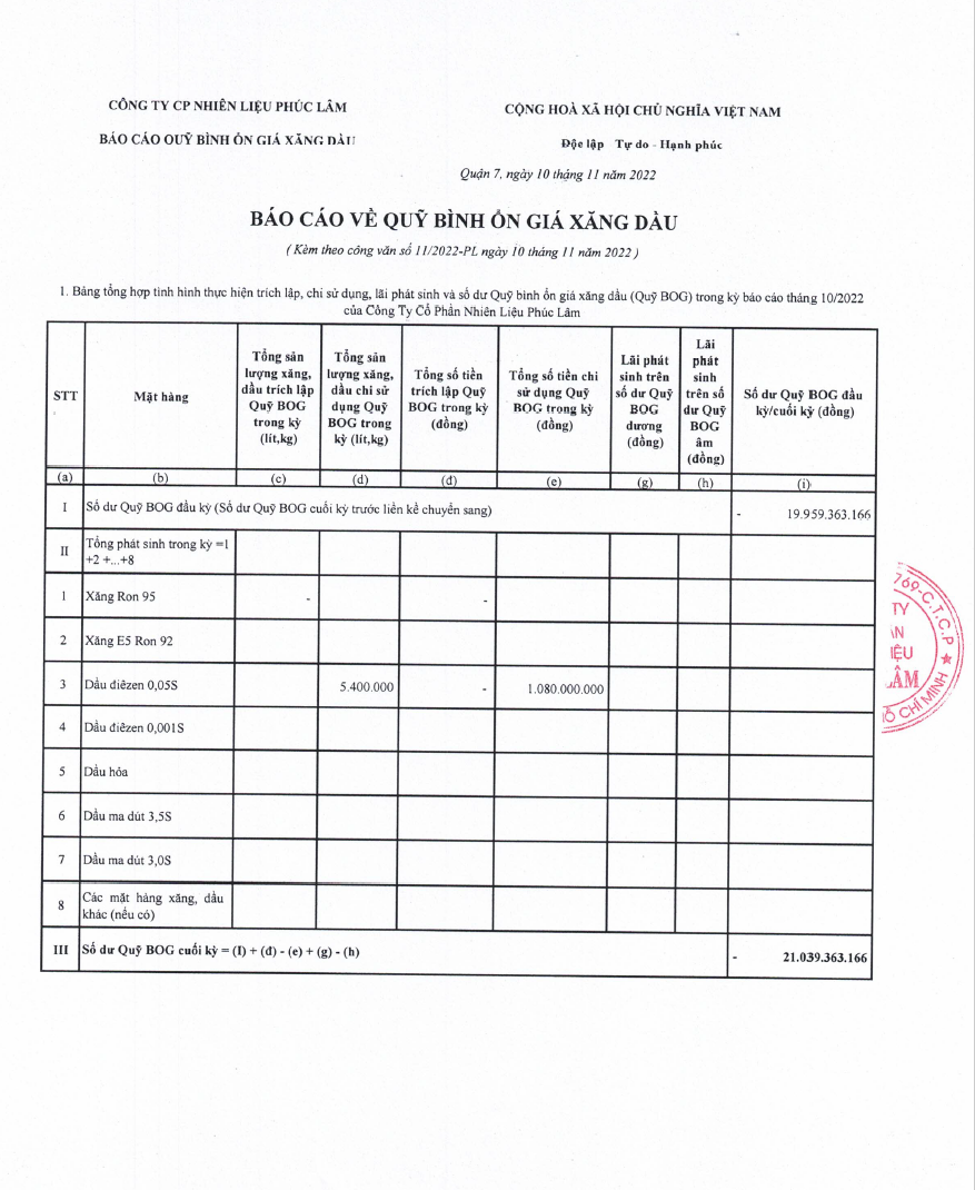 Công ty Cổ Phần Nguyên Liệu Phúc Lâm xin báo cáo Quỹ bình ổn giá xăng dầu Tháng 01.10-2022 - 31.10.2022 là: 21.039.363.166 vnđ