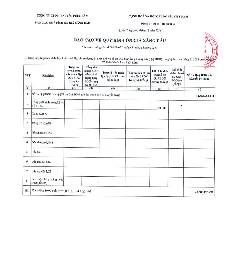 Công ty Cổ Phần Nguyên Liệu Phúc Lâm xin báo cáo Quỹ bình ổn giá xăng dầu Tháng 01.11.2024 - 31.11.2024 là: 42.588.195.995 vnđ