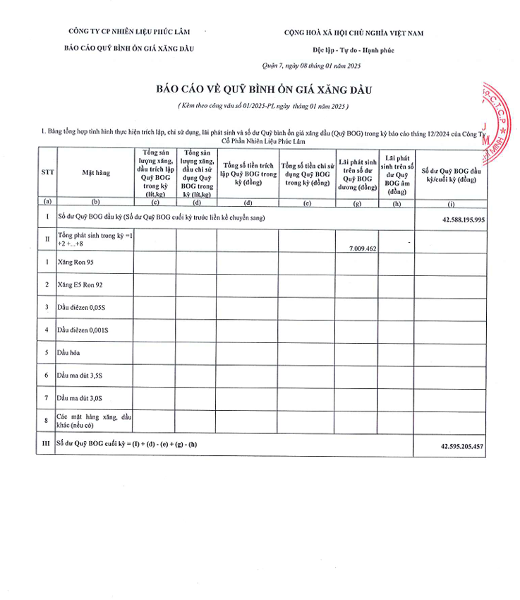 Công ty Cổ Phần Nguyên Liệu Phúc Lâm xin báo cáo Quỹ bình ổn giá xăng dầu Tháng 01.12.2024 - 31.12.2024 là: 42.595.205.457 vnđ