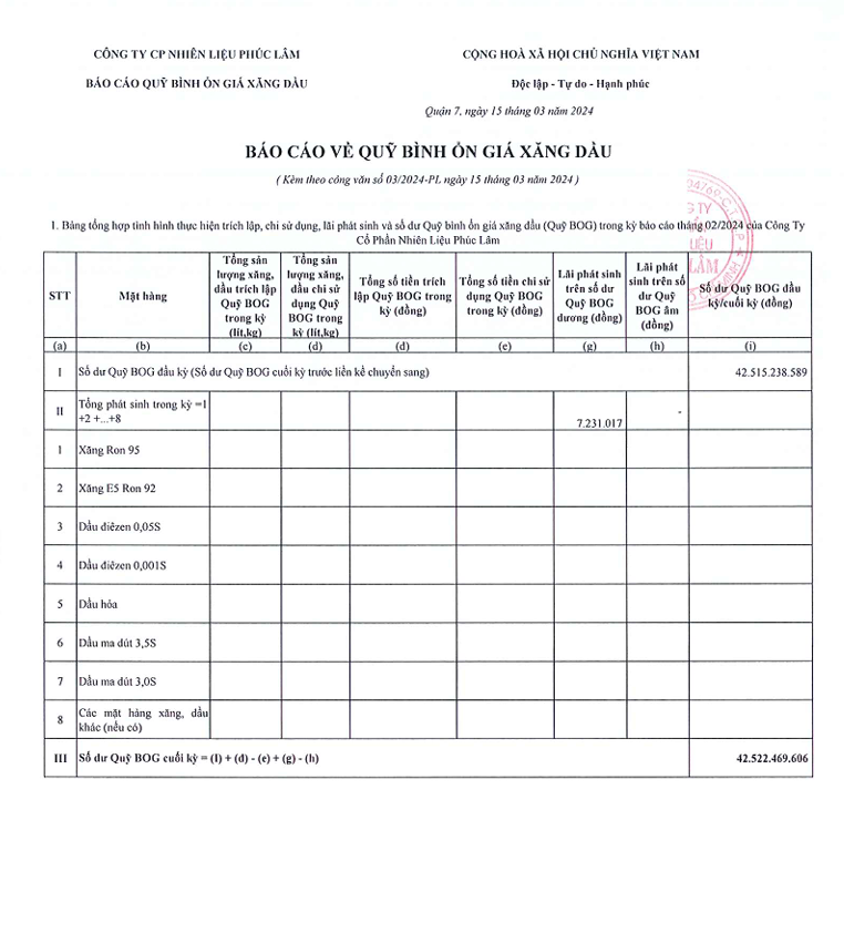 Công ty Cổ Phần Nguyên Liệu Phúc Lâm xin báo cáo Quỹ bình ổn giá xăng dầu Tháng 01.02.2024 - 29.02.2024 là: 42.522.469.606 vnđ