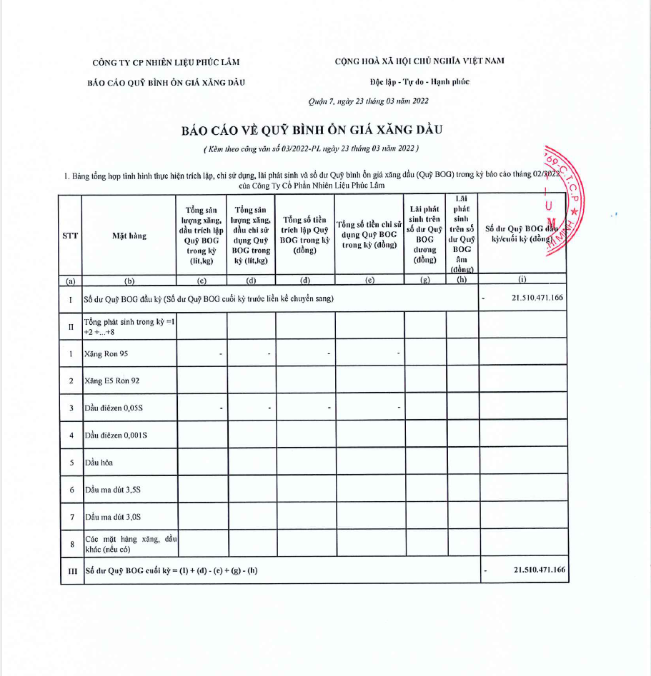 Công ty Cổ Phần Nguyên Liệu Phúc Lâm xin báo cáo Quỹ bình ổn giá xăng dầu Tháng 01.02-2022 - 28.2.2022 là: 21.510.471.166 vnđ