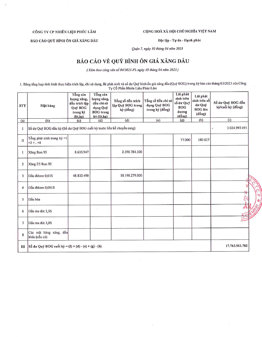 Công ty Cổ Phần Nguyên Liệu Phúc Lâm xin báo cáo Quỹ bình ổn giá xăng dầu Tháng 01.03.2023 - 31.3.2023 là: 17.763.961.782 vnđ