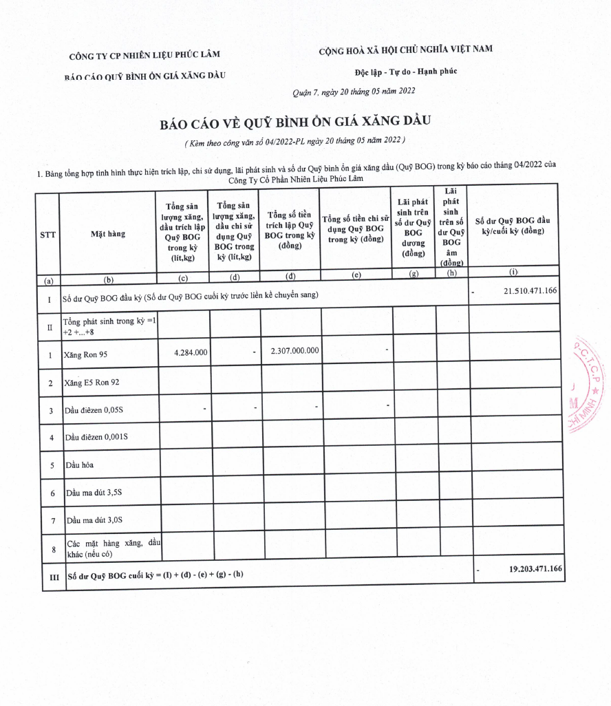 Công ty Cổ Phần Nguyên Liệu Phúc Lâm xin báo cáo Quỹ bình ổn giá xăng dầu Tháng 01.04-2022 - 30.4.2022 là: 19.203.471.166 vnđ