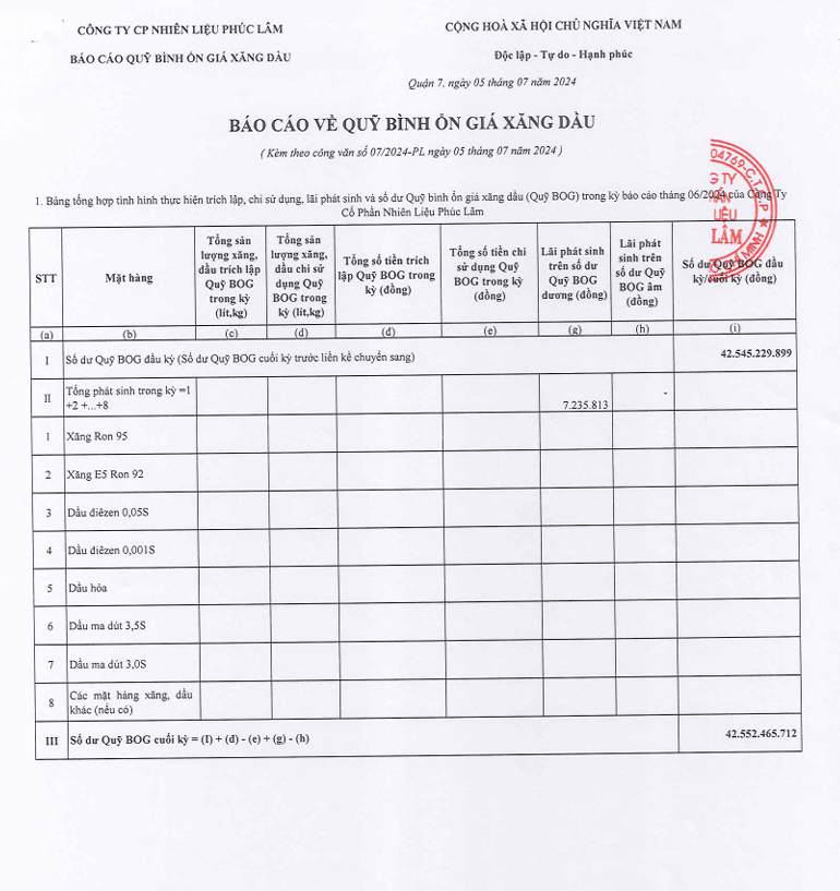 Công ty Cổ Phần Nguyên Liệu Phúc Lâm xin báo cáo Quỹ bình ổn giá xăng dầu Tháng 01.06.2024 - 30.06.2024 là: 42.552.465.712 vnđ