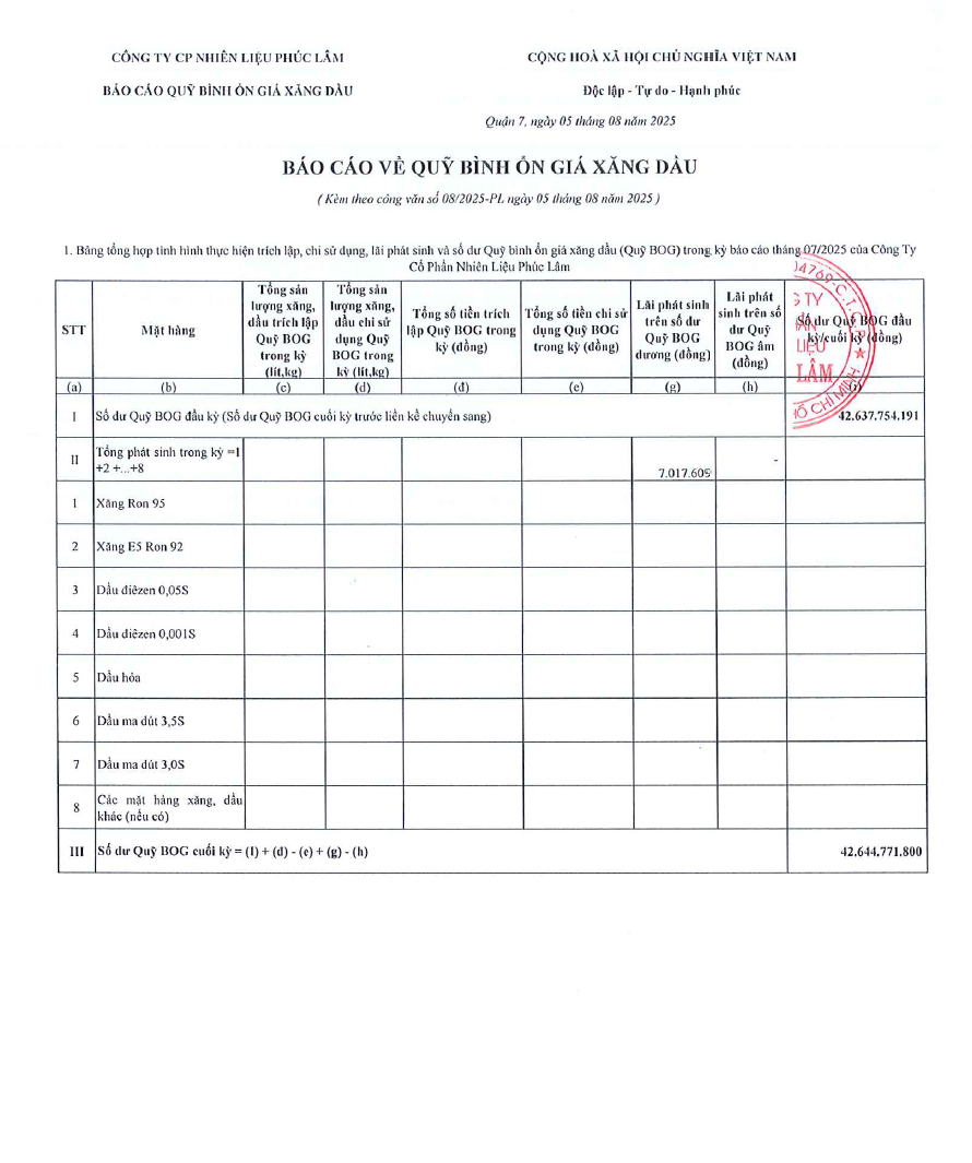 Công ty Cổ Phần Nguyên Liệu Phúc Lâm xin báo cáo Quỹ bình ổn giá xăng dầu Tháng 01.07.2025 - 31.07.2025 là: 42.644.771.800 vnđ