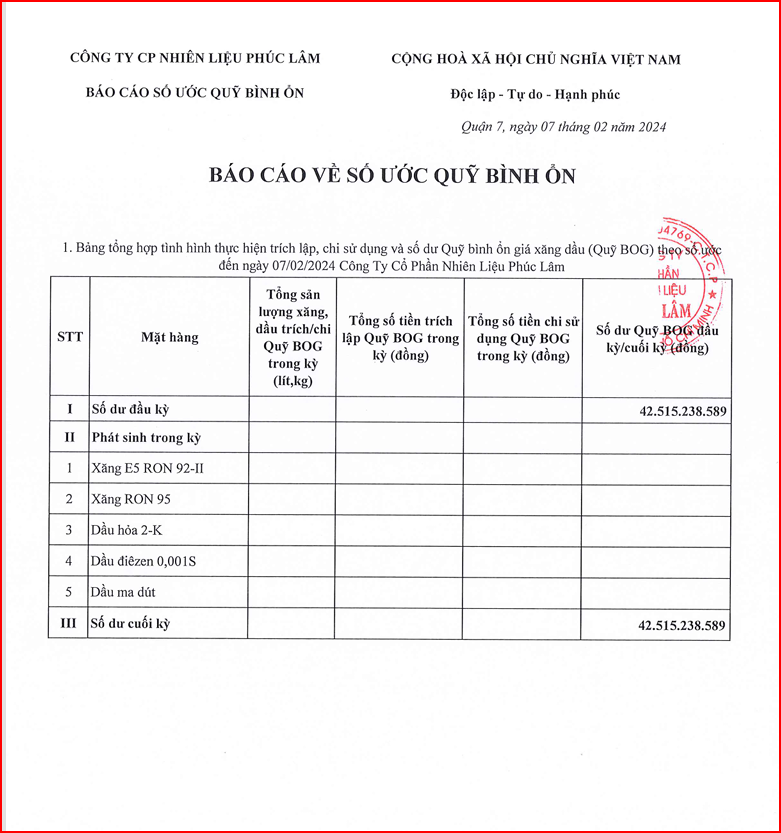 Công ty Cổ Phần Nhiên Liệu Phúc Lâm xin báo cáo Quỹ bình ổn giá xăng dầu Tuần 01.02.2024 - 07.02.2024 là: 42.515.238.589 vnđ