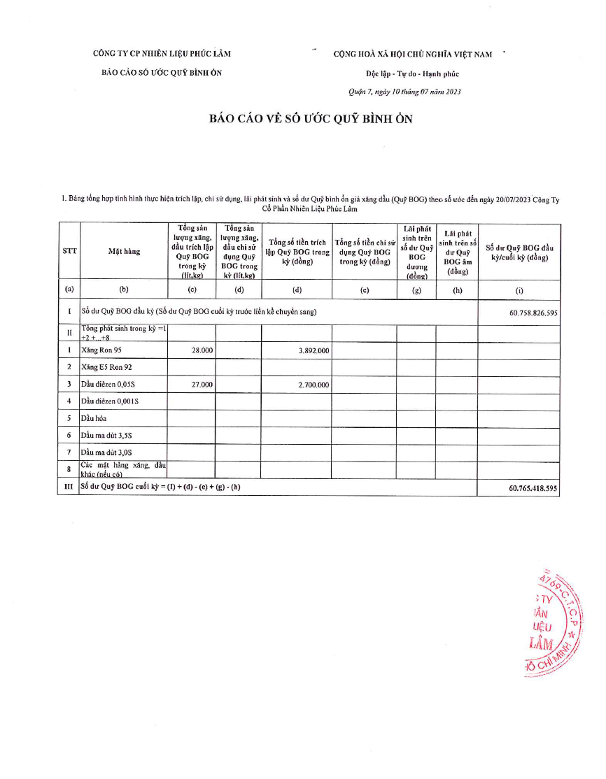 Công ty Cổ Phần Nguyên Liệu Phúc Lâm xin báo cáo Quỹ bình ổn giá xăng dầu Tháng 01.07.2023 - 20.7.2023 là:60.765.418.595 vnđ