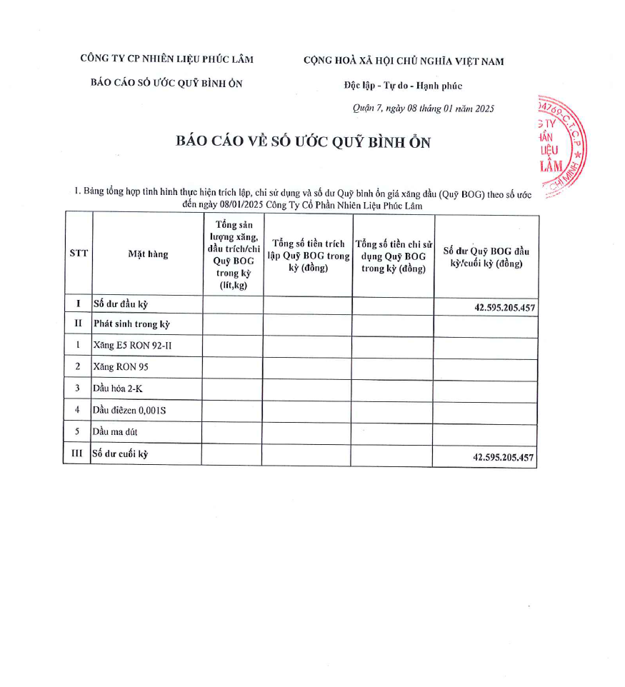 Công ty Cổ Phần Nguyên Liệu Phúc Lâm xin báo cáo Quỹ bình ổn giá xăng dầu Tuần 02.01.2025 - 08.01.2025 là: 42.595.205.457vnđ