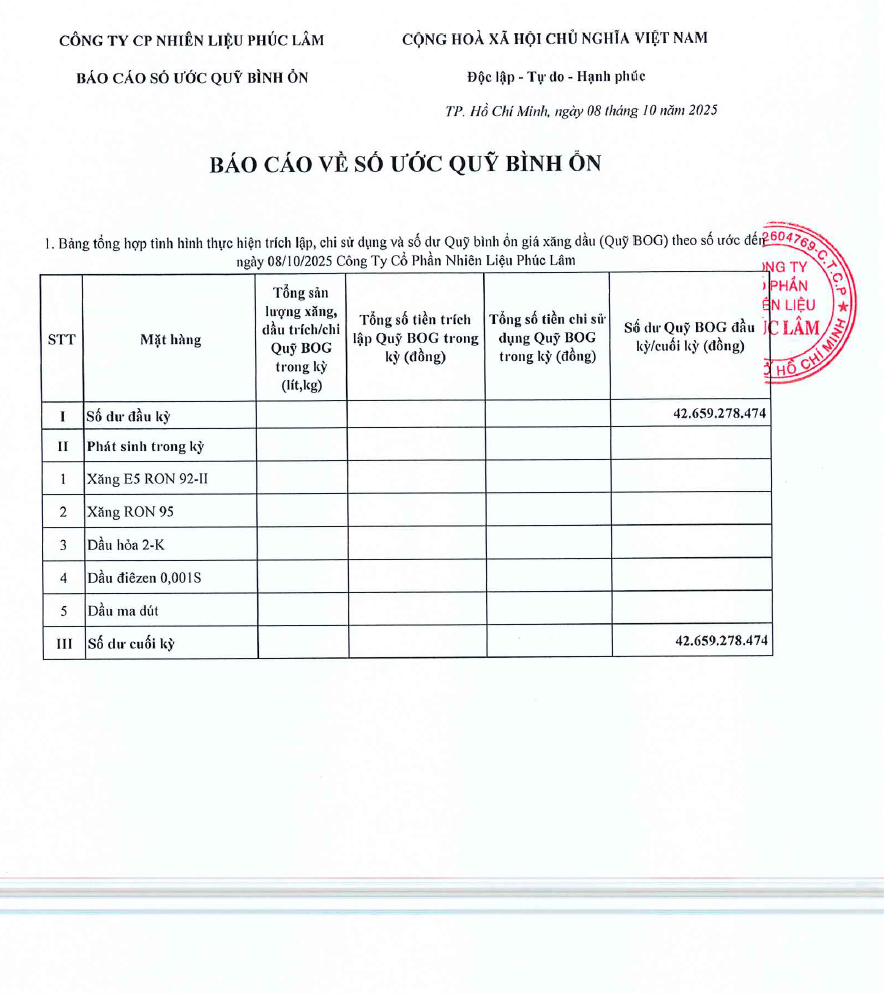 Công ty Cổ Phần Nguyên Liệu Phúc Lâm xin báo cáo Quỹ bình ổn giá xăng dầu Tuần 02.10.2025 - 08.10.2025 là: 42.659.278.474 vnđ