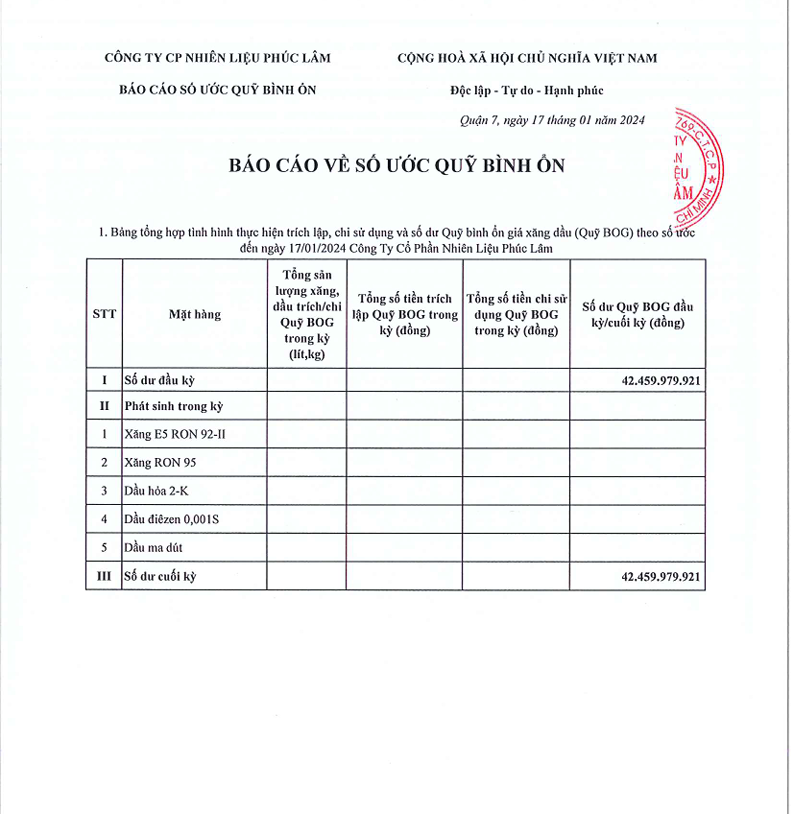 Công ty Cổ Phần Nguyên Liệu Phúc Lâm xin báo cáo Quỹ bình ổn giá xăng dầu Tuần 11.01.2024 - 17.1.2024 là: 42.459.979.921 vnđ