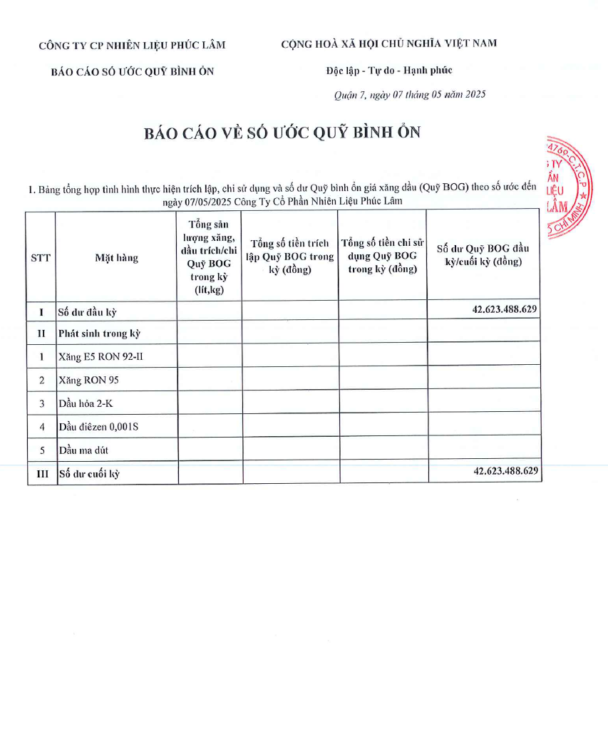 Công ty Cổ Phần Nguyên Liệu Phúc Lâm xin báo cáo Quỹ bình ổn giá xăng dầu Tuần 05.05.2025 - 07.05.2025 là: 42.623.488.629 vnđ