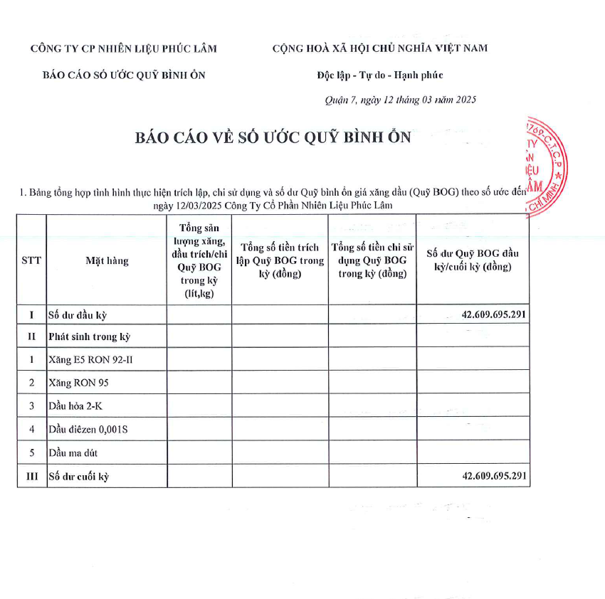 Công ty Cổ Phần Nguyên Liệu Phúc Lâm xin báo cáo Quỹ bình ổn giá xăng dầu Tuần 06.03.2025 - 12.03.2025 là: 42.609.695.291 vnđ