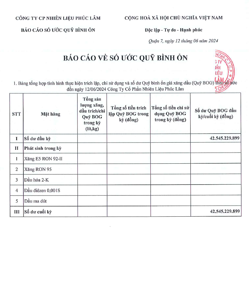 Công ty Cổ Phần Nguyên Liệu Phúc Lâm xin báo cáo Quỹ bình ổn giá xăng dầu Tuần 06.06.2024 - 12.06.2024 là: 42.545.229.899 vnđ