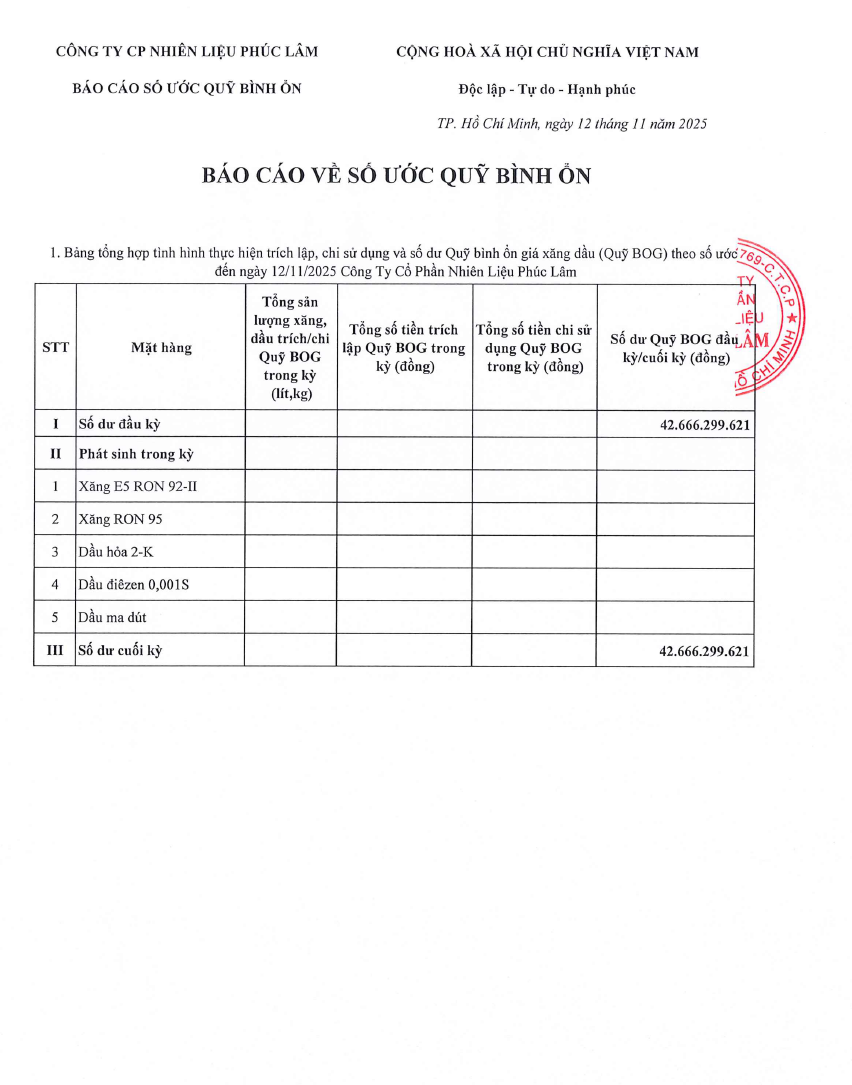 Công ty Cổ Phần Nguyên Liệu Phúc Lâm xin báo cáo Quỹ bình ổn giá xăng dầu Tuần 06.11.2025 - 12.11.2025 là: 42.666.299.621 vnđ