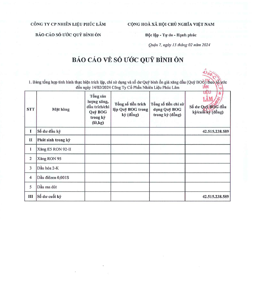 Công ty Cổ Phần Nguyên Liệu Phúc Lâm xin báo cáo Quỹ bình ổn giá xăng dầu Tuần 08.02.2024 - 14.02.2024 là: 42.515.238.589 vnđ