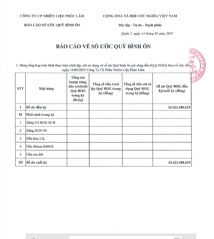 Công ty Cổ Phần Nguyên Liệu Phúc Lâm xin báo cáo Quỹ bình ổn giá xăng dầu Tuần 08.05.2025 - 14.05.2025 là: 42.623.488.629 vnđ