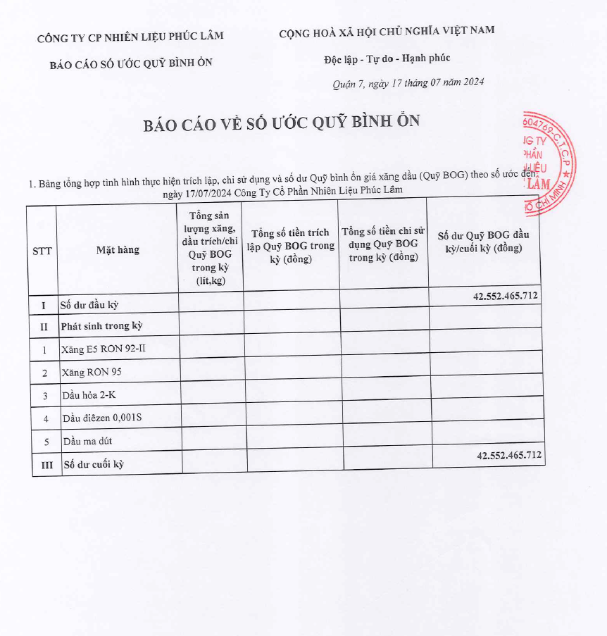 Công ty Cổ Phần Nguyên Liệu Phúc Lâm xin báo cáo Quỹ bình ổn giá xăng dầu Tuần 11.07.2024 - 17.07.2024 là: 42.552.465.712 vnđ