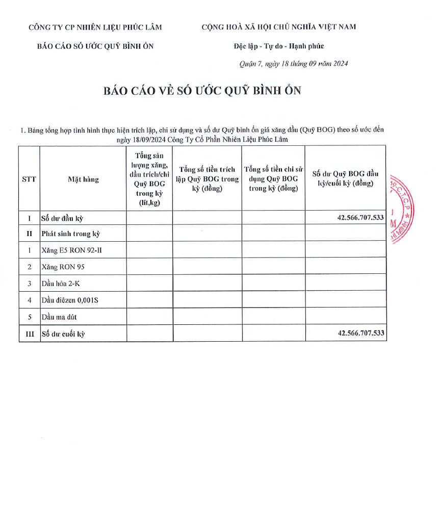 Công ty Cổ Phần Nguyên Liệu Phúc Lâm xin báo cáo Quỹ bình ổn giá xăng dầu Tuần 12.09.2024 - 18.09.2024 là: 42.566.707.533 vnđ