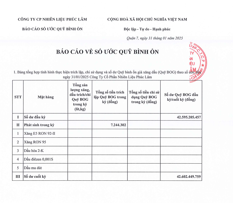 Công ty Cổ Phần Nguyên Liệu Phúc Lâm xin báo cáo Quỹ bình ổn giá xăng dầu Tuần 23.01.2025 - 31.01.2025 là: 42.602.449.759vnđ