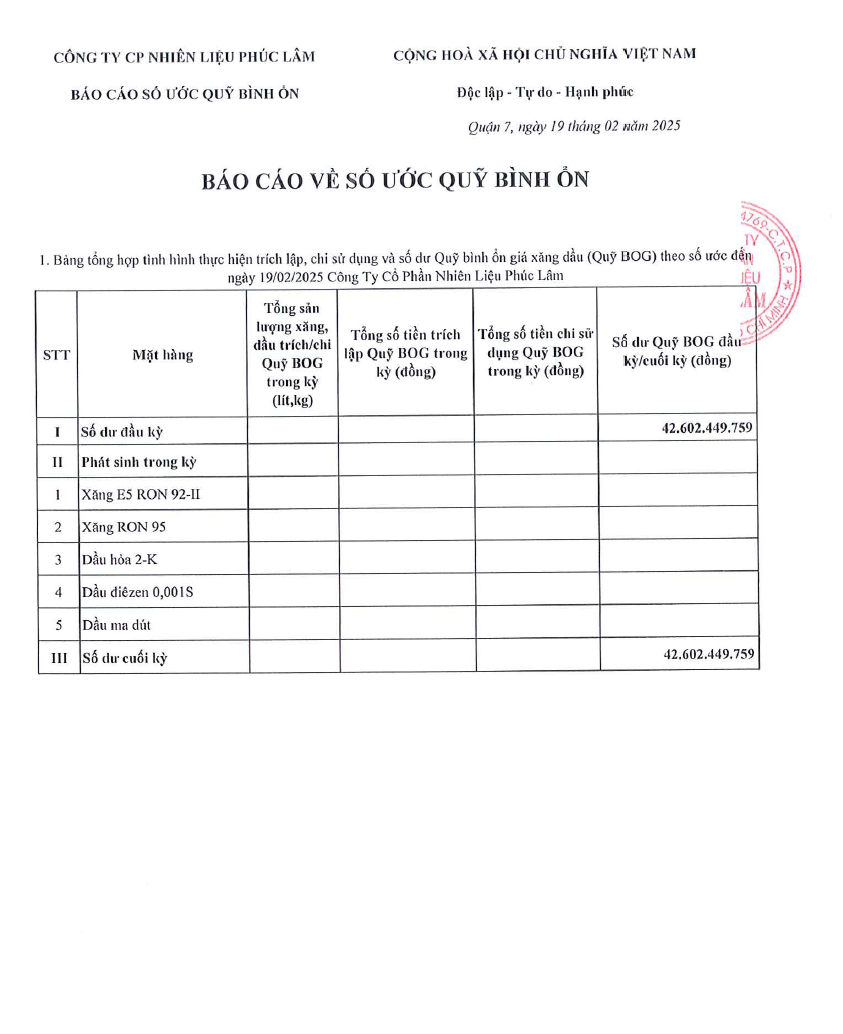 Công ty Cổ Phần Nguyên Liệu Phúc Lâm xin báo cáo Quỹ bình ổn giá xăng dầu Tuần 13.02.2025 - 19.02.2025 là: 42.602.449.759 vnđ