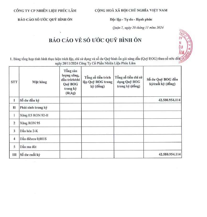 Công ty Cổ Phần Nguyên Liệu Phúc Lâm xin báo cáo Quỹ bình ổn giá xăng dầu Tuần 14.11.2024 - 20.11.2024 là: 42.580.954.114 vnđ