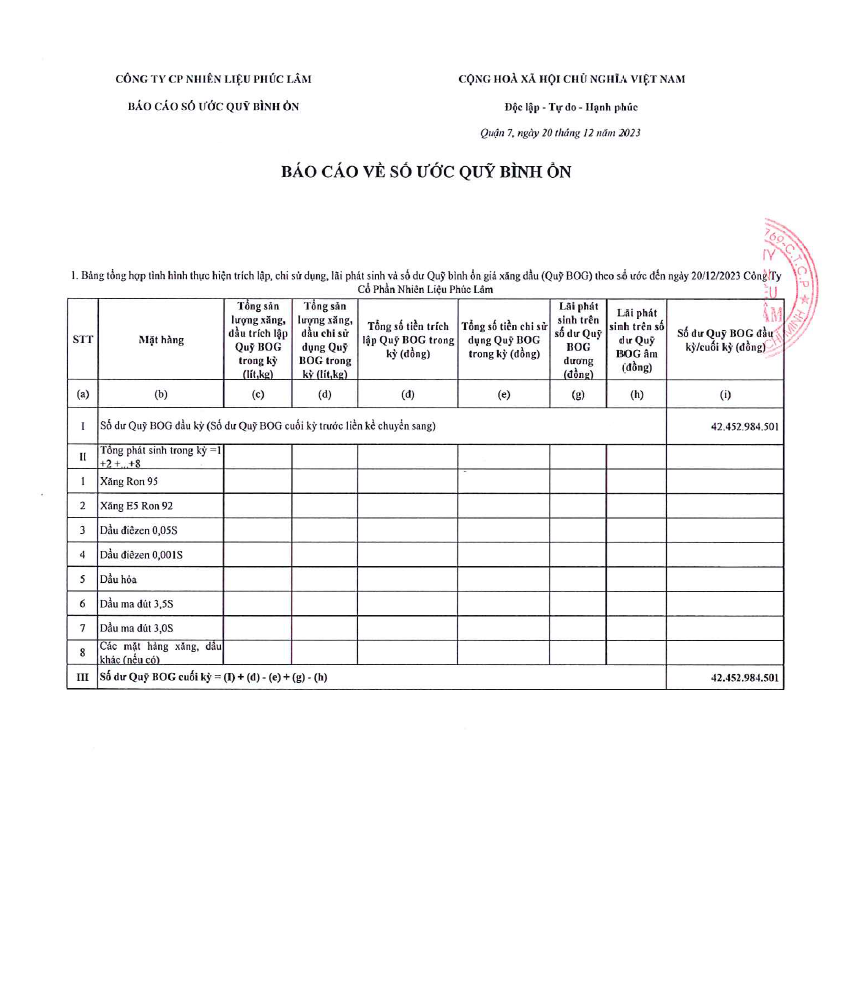 Công ty Cổ Phần Nguyên Liệu Phúc Lâm xin báo cáo Quỹ bình ổn giá xăng dầu Tuần 14.12.2023 - 20.12.2023 là: 42.452.984.501 vnđ
