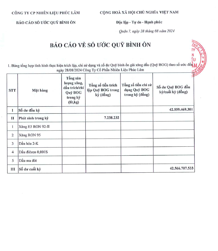 Công ty Cổ Phần Nguyên Liệu Phúc Lâm xin báo cáo Quỹ bình ổn giá xăng dầu Tuần 22.08.2024 - 28.08.2024 là: 42.566.707.533 vnđ
