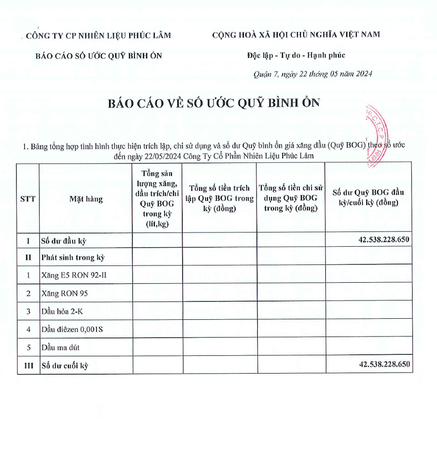 Công ty Cổ Phần Nguyên Liệu Phúc Lâm xin báo cáo Quỹ bình ổn giá xăng dầu Tuần 16.05.2024 - 22.05.2024 là: 42.538.228.650 vnđ