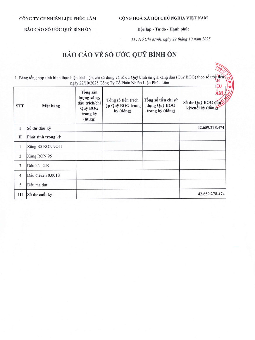 Công ty Cổ Phần Nguyên Liệu Phúc Lâm xin báo cáo Quỹ bình ổn giá xăng dầu Tuần 16.10.2025 - 22.10.2025 là: 42.659.278.474 vnđ