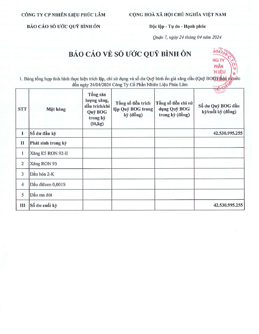 Công ty Cổ Phần Nguyên Liệu Phúc Lâm xin báo cáo Quỹ bình ổn giá xăng dầu Tuần 17.04.2024 - 24.04.2024 là: 42.530.995.255 vnđ