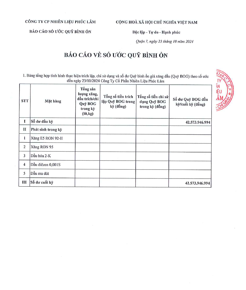 Công ty Cổ Phần Nguyên Liệu Phúc Lâm xin báo cáo Quỹ bình ổn giá xăng dầu Tuần 17.10.2024 - 23.10.2024 là: 42.573.946.994 vnđ