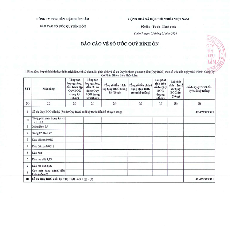 Công ty Cổ Phần Nguyên Liệu Phúc Lâm xin báo cáo Quỹ bình ổn giá xăng dầu Tuần 18.12.2023 - 03.1.2024 là: 42.459.979.921 vnđ