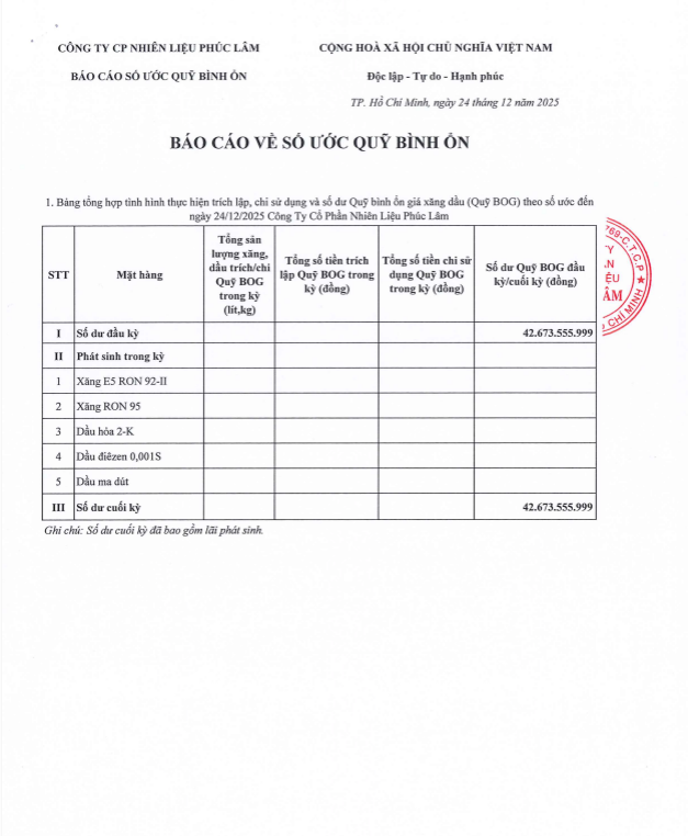 Công ty Cổ Phần Nhiên Liệu Phúc Lâm xin báo cáo Quỹ bình ổn giá xăng dầu Tuần 18.12.2025 - 24.12.2025 là: 42.673.555.999 vnđ