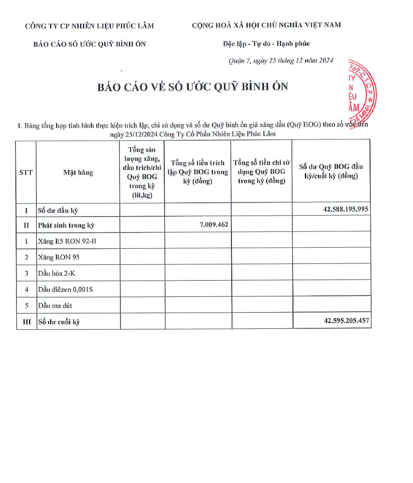 Công ty Cổ Phần Nguyên Liệu Phúc Lâm xin báo cáo Quỹ bình ổn giá xăng dầu Tuần 19.12.2024 - 25.12.2024 là: 42.588.195.995 vnđ