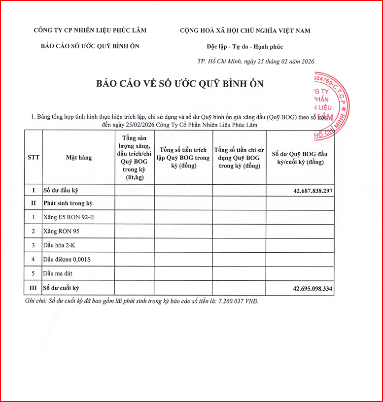 Báo cáo Quỹ bình ổn giá xăng dầu Tuần 20.02.2026 - 25.02.2026