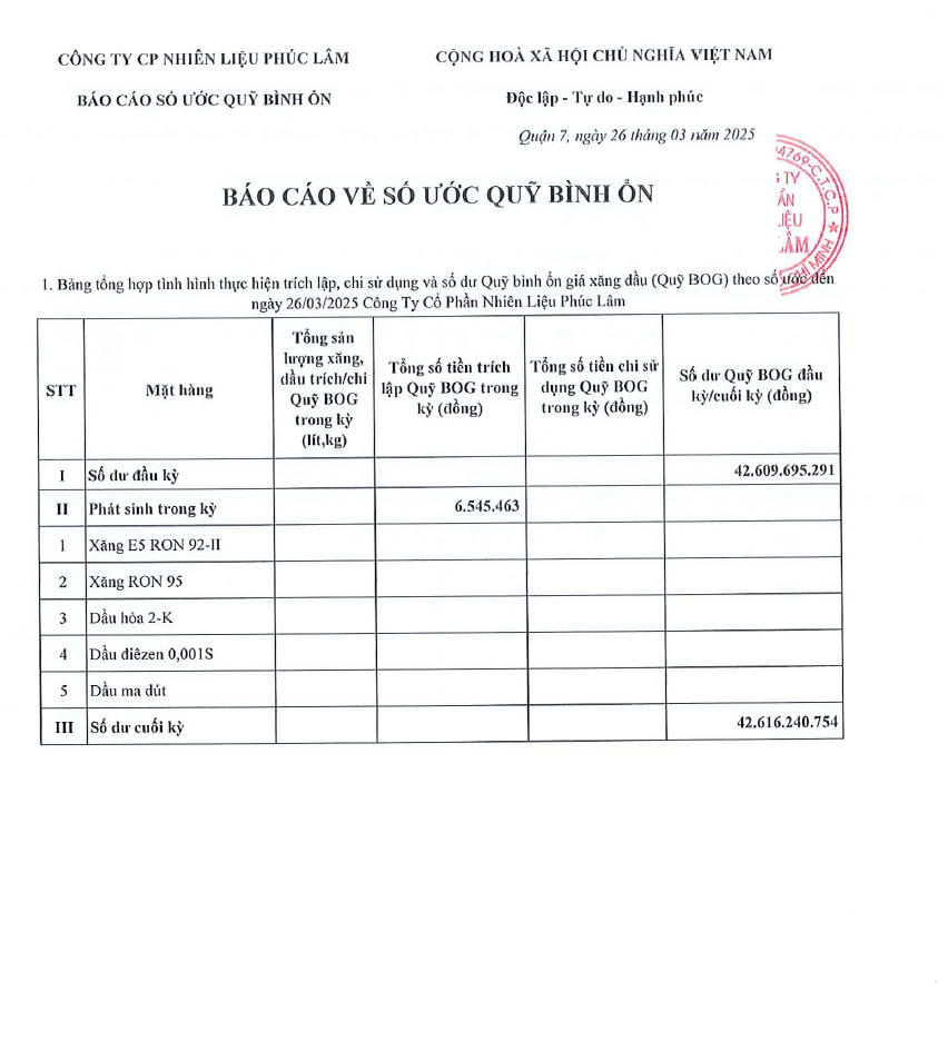 Công ty Cổ Phần Nguyên Liệu Phúc Lâm xin báo cáo Quỹ bình ổn giá xăng dầu Tuần 20.03.2025 - 26.03.2025 là: 42.616.240.754 vnđ