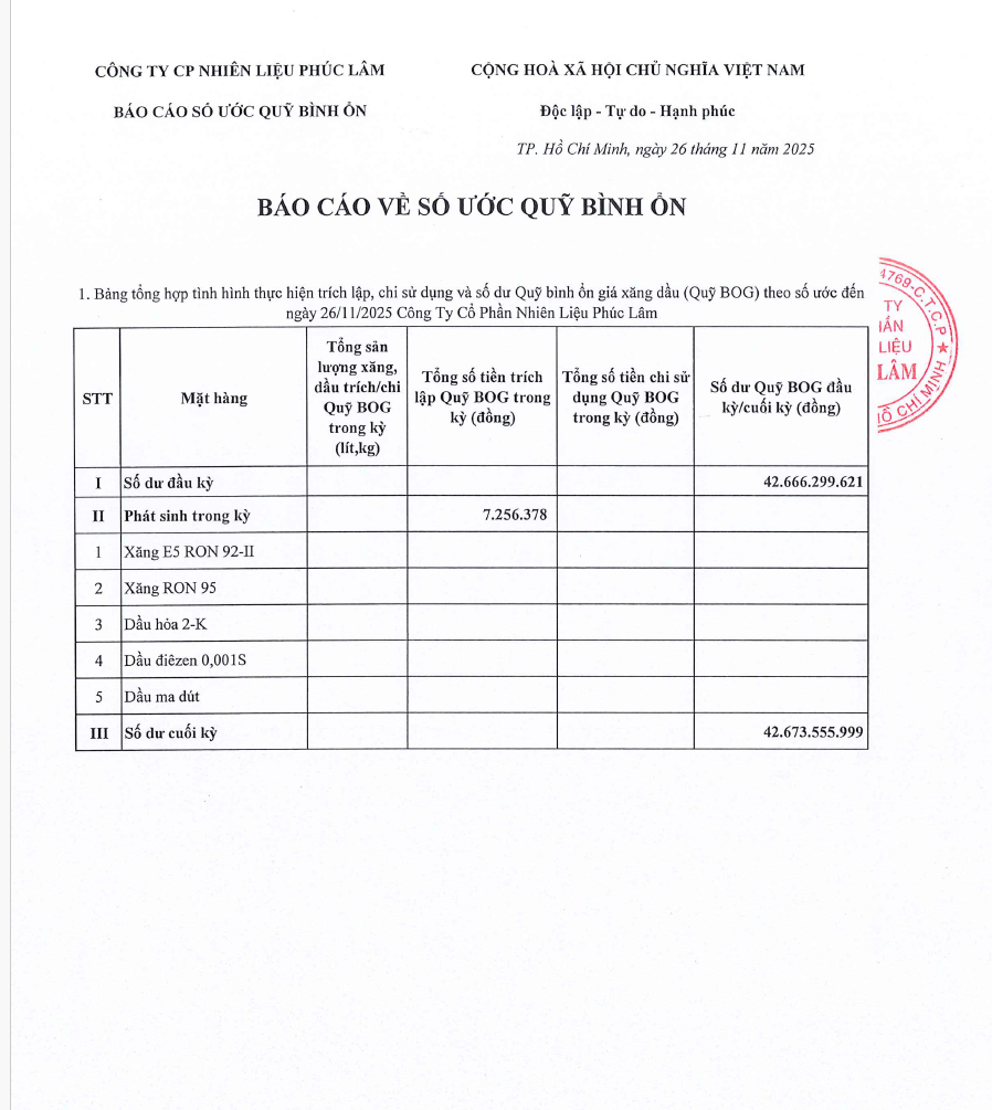 Công ty Cổ Phần Nguyên Liệu Phúc Lâm xin báo cáo Quỹ bình ổn giá xăng dầu Tuần 20.11.2025 - 26.11.2025 là: 42.673.555.999 vnđ