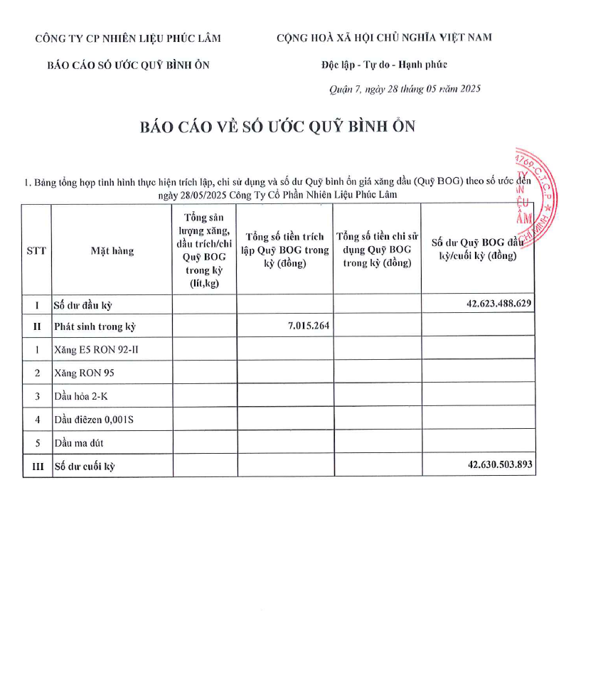 Công ty Cổ Phần Nguyên Liệu Phúc Lâm xin báo cáo Quỹ bình ổn giá xăng dầu Tuần 22.05.2025 - 28.05.2025 là: 42.630.503.893 vnđ