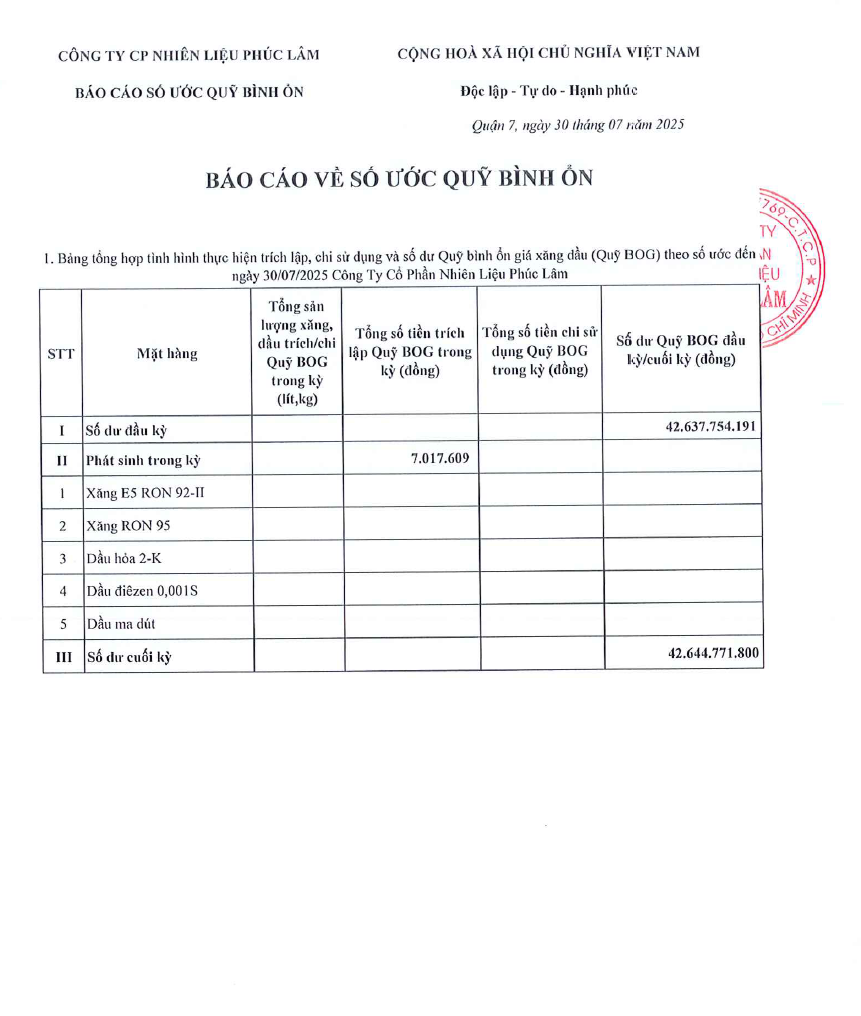 Công ty Cổ Phần Nguyên Liệu Phúc Lâm xin báo cáo Quỹ bình ổn giá xăng dầu Tuần 24.07.2025 - 30.07.2025 là: 42.637.754.191 vnđ