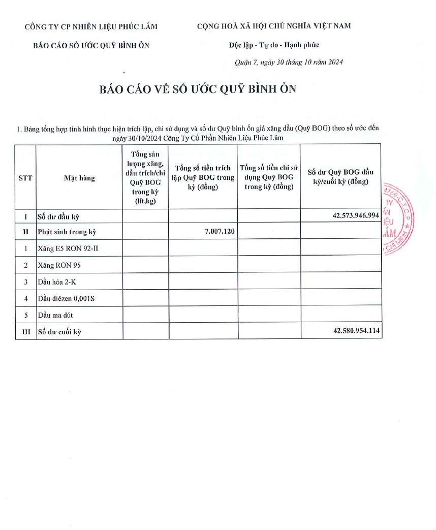 Công ty Cổ Phần Nguyên Liệu Phúc Lâm xin báo cáo Quỹ bình ổn giá xăng dầu Tuần 24.10.2024 - 30.10.2024 là: 42.580.954.114 vnđ