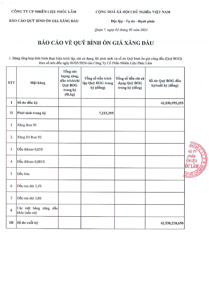 Công ty Cổ Phần Nguyên Liệu Phúc Lâm xin báo cáo Quỹ bình ổn giá xăng dầu Tuần 25.04.2024 - 01.05.2024 là: 42.538.228.650 vnđ